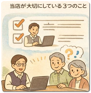同じ画面を一緒に見ながら、「今何が起きているのか」「どう直していくのか」を丁寧にお伝えします。高齢のお客様にも、安心してご相談いただけるよう心がけています。 - 3.業者の都合ではなく、お客様にとって一番良い方法をご提案すること