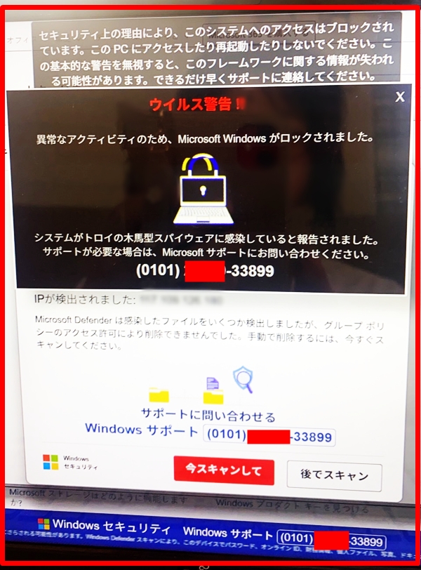 特に最近は、ウイルスではなく「偽の警告」や「サポート詐欺」のケースがとても増えています。