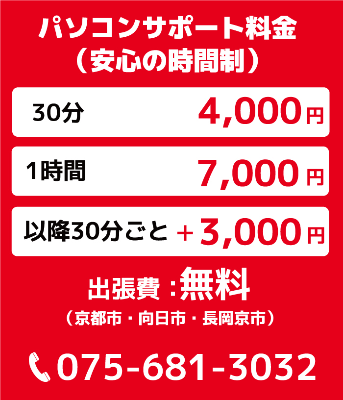 京都市南区・伏見区・向日市・長岡京市を中心に、パソコン修理・SSD交換・動作改善・メール設定・ネット接続トラブルなど、内容によって料金が異なります。作業前に必ずお見積りを提示し、わかりやすい料金体系で対応しております。